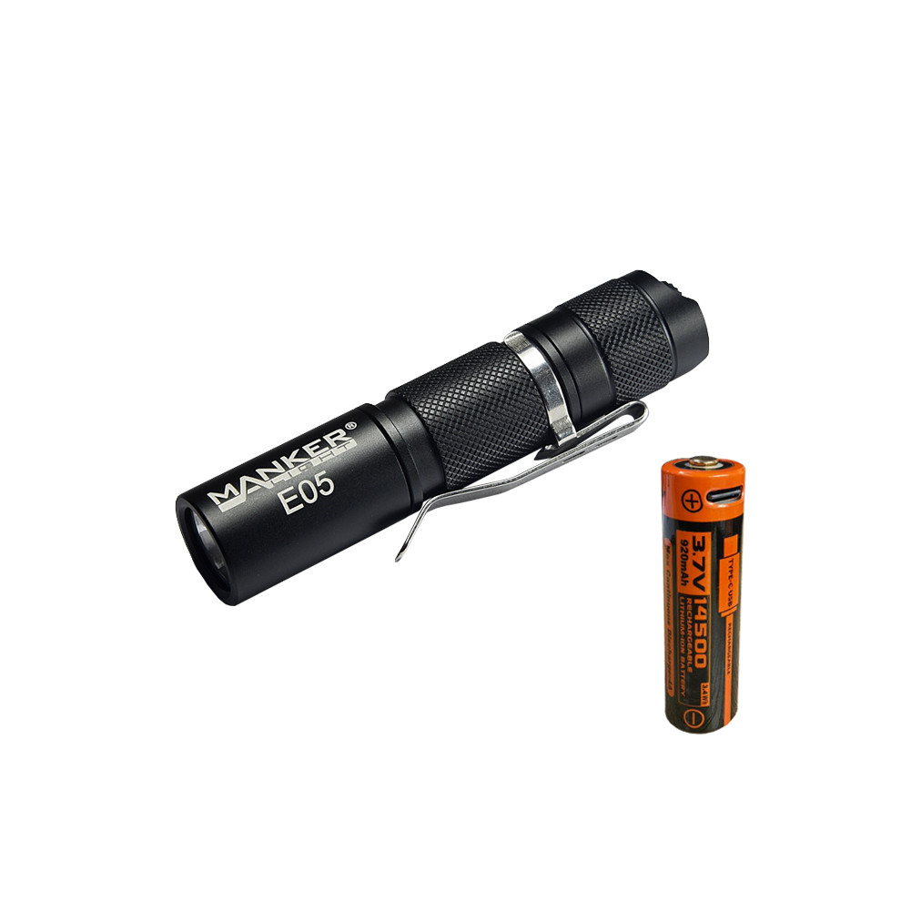 Package content: 1x Manker E05 Every Day Carry Pocket Flashlight(Check Here) 1x Manker 920mAh Type-C USB 14500 rechargeable li-ion battery1x Type-C USB charging cable